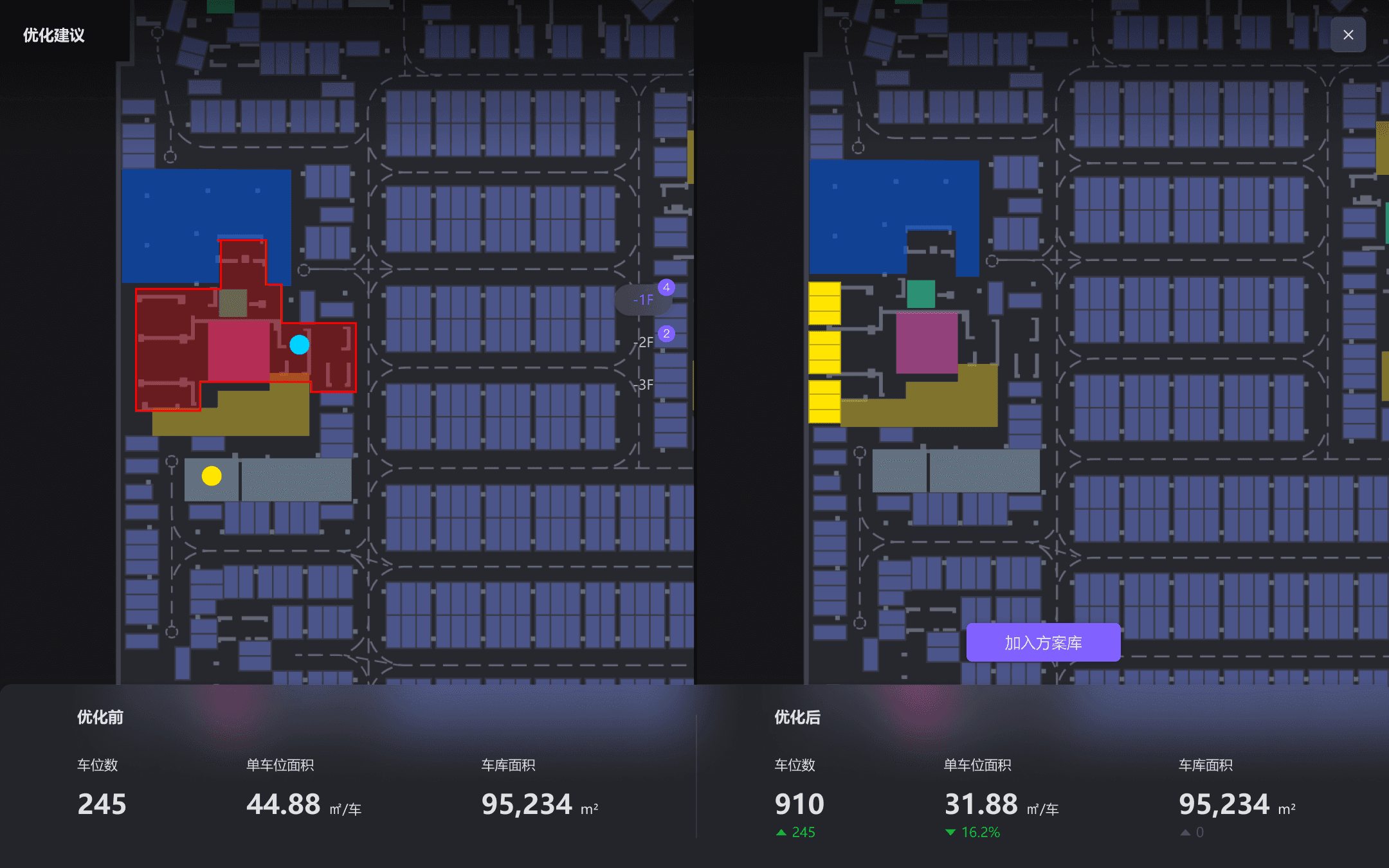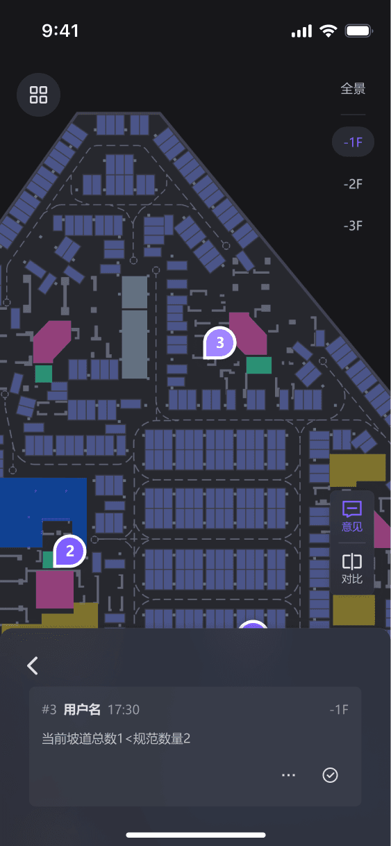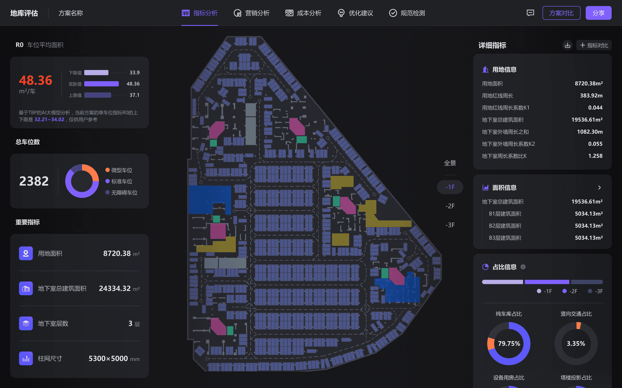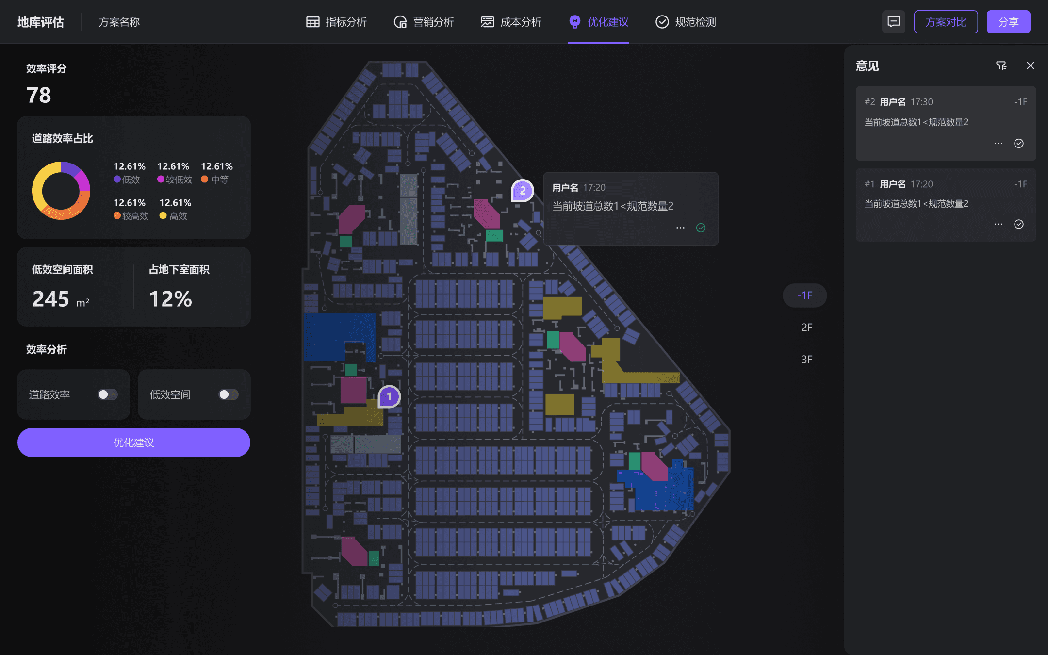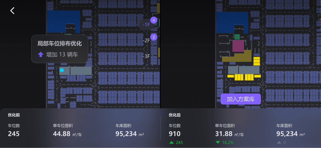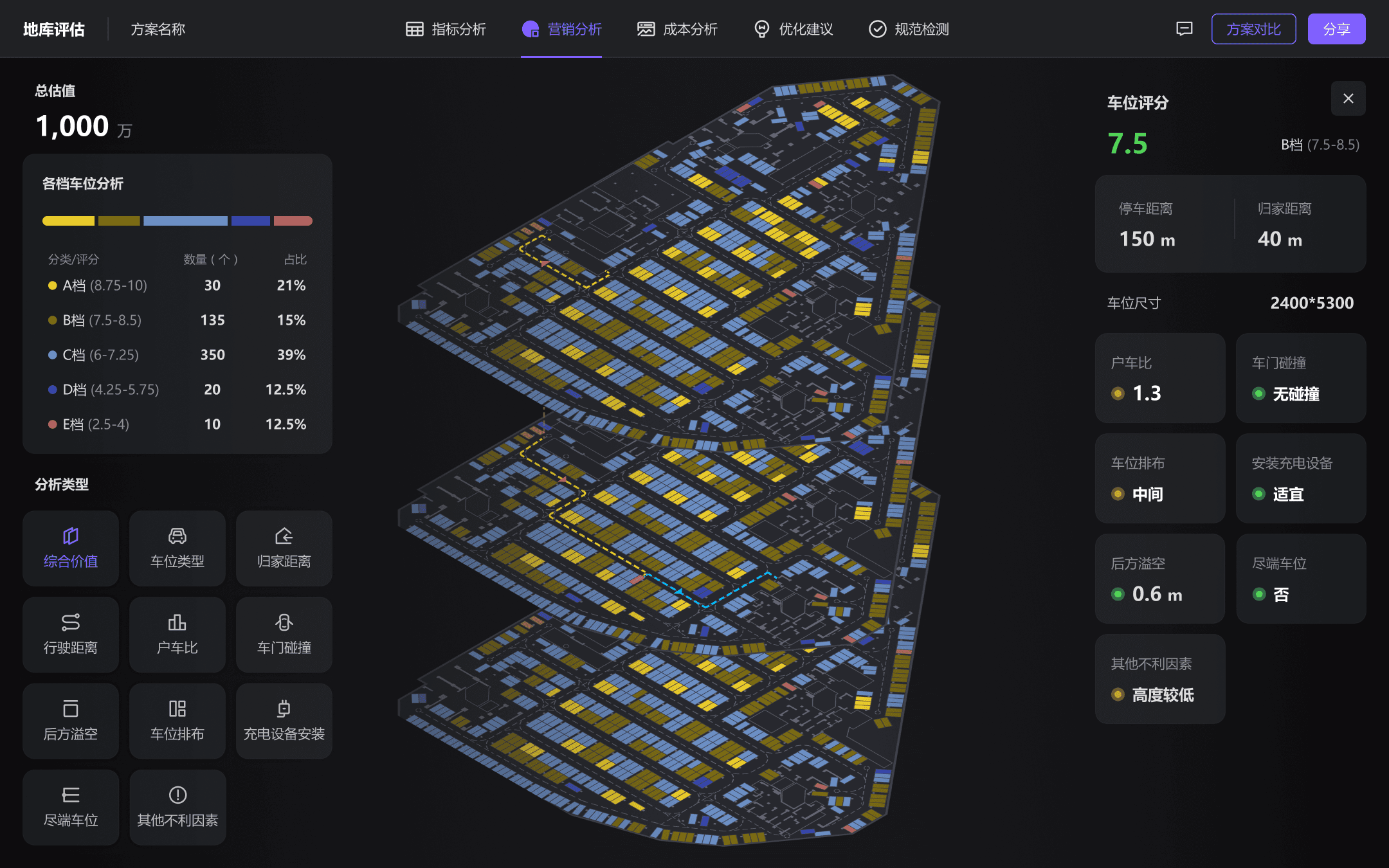 各类营销价值分析,使用条形图及图纸车位可视化填充展现,并且优化了车位评分功能的交互流程,减少了功能步骤,用户能在图纸中迅速定位理想车位。